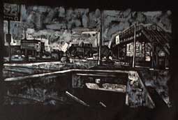 Не без иронии конечно, так, на одной из работ прямо под семафором с надписью «1-я пятилетка», крупно выведено белыми буквами: PAL/AUTO…