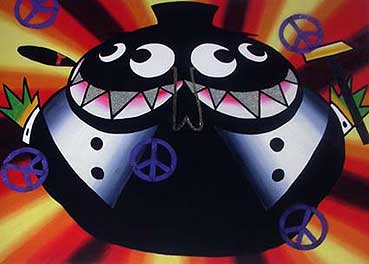 Однако вернемся к выставке Шутова, на коей представлено полтора десятка новых произведений художника. Яркие, переливающиеся акрилом холсты оторочены искусственным мехом леопардовых и иных не менее экзотических расцветок. На этот раз предметом исследования Шутова стали советские утопии разных лет. Часть работ являет собой образы карикатурных капиталистов, раздувшихся от собственной значительности.