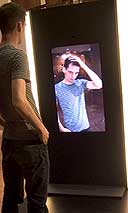 Почти все из представленных объектов интерактивны и рассчитаны на апробацию и тестирование зрительских реакций. Фактически аттракцион начинается у самого порога, где публика сталкивается с колдовским DelayMirror – дезориентирующим зеркалом нового тысячелетия. Мельчайшие нюансы поведения отражающегося в нем индивида транслируются с 3-х секундной задержкой, человек видит себя в прошлом – очень странное и жутковатое ощущение. На самом деле никакой мистики – вместо амальгамы использован гигантский плазменный экран, сверху закреплена микрокамера + пара программ - и вы диссоциированы. |