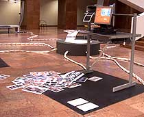 Еще один объект Brainball (показанный ранее в М’АРСе на фестивале Art Digital) неизменно вызывает ажитацию всех слоев населения. «Брэйнбол» - это в высшей степени необычная игра, опровергающая представления об агональном духе, настоящий осиновый кол в Homo Ludens Йохана Хёйзинги. Для того, чтобы выиграть, т.е. закатить шарик в ворота соперника, игроки со специальными электродоначинёнными повязками на лбах, должны максимально расслабиться. При помощи оперативного считывания электрической активности мозга аппарат безошибочно распознаёт подлинных мастеров дзен-релаксации (а также жертв лоботомии) и вознаграждает их выигрышем. |