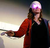 Другое устройство - Monochromeye – волшебный напальчник с датчиками и шлем, напоминающий каску инопланетного Хищника из одноименного фильма - наверняка заинтересовало бы и самого Рудольфа Арнхейма. При указании пальцем на тот или иной предмет сенсоры реагируют особым образом и световые диоды «выбрасывают» в глаза подопытного зрителя пучки света. |