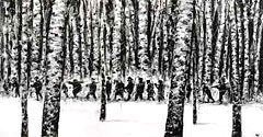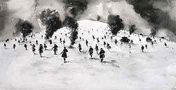 По небу расплываются дымные шлейфы, оставленные боевыми самолётами, сигнальные ракеты взлетают в воздух, силуэты зенитных установок рассекают вспышки многочисленных взрывов, по снежным полям бегут в атаку батальоны, а партизанские группы пробираются на задание между стволов березовой рощи – именно так выглядит художественный дневник Великой Отечественной войны в исполнении Константина Батынкова.