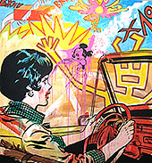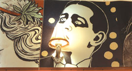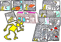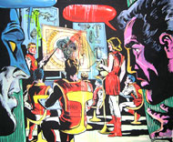 Дьявольское мельтешение акриловых комикс-кадзе в своей спрессованной и избыточной концентрации – совершеннейший бесовский маскарад в духе Иеронима Босха, обнаружить здесь какую-либо логику довольно затруднительно. Рыцарственный Супермен и находчивый Бэтмен, бездушные в своей функциональности члены Нового Правительства, цветы-зомби, причудливые йоги и пытливые муравьи-психопаты – всё смешалось и вышло за пределы рамок обывательского здравомыслия.