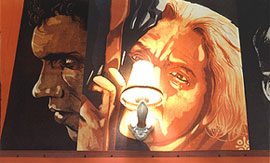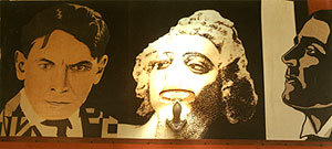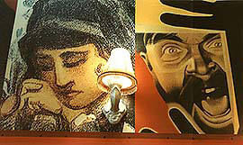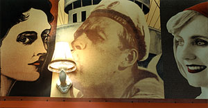 Общий пафос торжественного ретропарада нарушается одной деталью, назойливо повторяющейся и обнаруживающейся в каждой без исключения работе. Безмятежно скользя по изобразительным поверхностям, глаз неожиданным образом выхватывает слащавые бра с бахромой, бесцеремонно торчащие порой чуть ли не из нарисованных физиономий и освещающие их неуместным светом дешёвого кооперативного кафе.