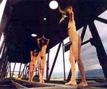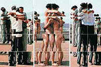 Второе, - на фотографиях Гао люди обнимаются в изрядных количествах. Они делают это повсеместно: на городских улицах и площадях, на берегах рек, в театрах, скверах, одним словом – везде. Само собой, часть обнимающихся рискованно обнажено, что, в рамках контрастного сопоставления, создает определенное драматургическое напряжение. Натурщики представляют все срезы современного общества – в наличии спортсмены, военные, полицейские, влюбленные парочки, разношерстная молодежь, рабочие и т.д. Многие из них обнимаются так, словно бы прощаются с жизнью.