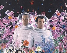 Вне всякого сомнения, московская гастроль классиков китч-арта Пьера и Жиля, устроенная МДФ – мероприятие запредельной яркости. Цокольный этаж ЦВЗ «Манеж» по пояс залит сиропом, в ассортименте – молодость и красота (преимущественно юношеская), поэтизация нежной мужской дружбы, тропическая ослепительность милых сценок, тотальная пародия на катарсис, etc. Масштабы этой визуальной интрузии впечатляют – десятки раскрашенных фотографий на алюминии маркируют различные этапы творческой судьбы дуэта.