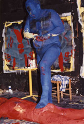 - Что для вас как художника было тогда важно? - Знаете, какое дело, мне всё время хотелось быть внутри своего собственного произведения. У меня даже есть такие фотографии с оттисками своего тела, когда я что-то красил и старался сделать так, чтобы цвет тела и цвет нанесённой краски был сопоставим. Мне хотелось стать как бы частью своей работы, частью изображения.