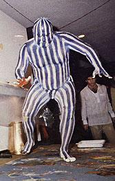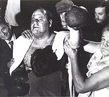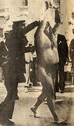 А я был совершенно голым, ну и меня голым повезли в тюрьму. Привезли в первое полицейское отделение, там дамы, а я с красным раскрашенным х**м. Ну, там буфет был, и на меня тут же одели фартук. Промучили долго, но часов в десять отвезли в тюрьму, которая уже вся орала. Надо сказать, что там у них в тюрьме телевизоры, вино дают. И когда меня привели в камеру, где меня прописали, ребята мне сразу дали вина белого, и я немеряно надрался. И все кричали охранникам: «Супериори, супериори! Где тот самый человек?». Судили меня на восьмой или девятый день, когда как раз и стреляли в Папу. А поскольку все газеты вышли на следующий день после перформанса, там были опубликованы разные фотографии – как я кричал, как меня в полицию везли, с комментариями типа - «Его жена еще не знает, что ей долго придется ночевать одной». Смешно сейчас это вспоминать. Но в этих газетах было отмечено, что я кричал: «Итальянцы, берегите Папу!». После чего стали разноситься реплики: «Пророк!». Церковь нажала, и меня отпустили. Полиция с ненавистью дала билет, меня засунули в поезд, а они стояли ждали, пока поезд не отправится. |