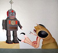 Диковинные роботы, напоминающие истуканов с острова Пасхи, недоверчиво пучат механические окуляры, в то время как членистоногие фигуранты пытаются телепатически просканировать своих противников. Анекдотические сюжеты Денисова - настоящий реванш абсурдизма, психиатрический бенефис, душераздирающие модификации жанровых кодов. Эта выставка - «Звёздный десант» по-русски, с заколдованными принцами в главных ролях, причудливая проекция ночных кошмаров, трагикомическая и бесчеловечная финализация проекта.