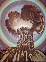 Вертикальная устремлённость на фоне калейдоскопических переливов маркирует влечение художника к психоделическому визионерству. Явлена параллельная реальность, имеющая большее отношение к диковинным грёзам, нежели к злонамеренному апокалиптическому моделированию. Обилие ядерных грибов в версии Шутова мало связано с привычными миротворческими страстями борцов за разоружение – символизация здесь несколько иная.