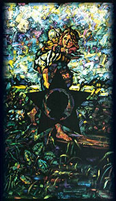 Порой возникает впечатление, что вот-вот из подпола появится делегация серьезных гномов и начнет хором декларировать Хайдеггера. Как бы то ни было, живописным панно аккомпанируют эффектно поблескивающие скульптурные композиции из… угля. Анзельм нашел свою жилу - на специальных постаментах покоятся: череп с костями, модель истребителя, каменный цветок, октябрятская звездочка изрядной величины, предметы религиозного культа и даже маузер.