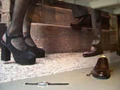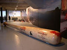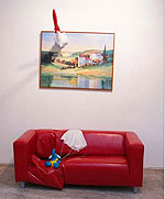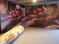 В ассортименте: циклопическая бейсбольная бита в крови, монументальный ботинок в луже крови, зонтик, разумеется, в крови, металлические контейнеры-клетки со сваленной внутри пропитанной кровью одеждой. Помимо этого в репертуаре – фотографический ретро-цикл со стекающими вниз ручейками крови, фотографии окровавленных жертв уличных конфликтов, столовой, затопленной кровью и забрызганными кровью очками Джона Леннона. Одним словом, настоящий праздник для вампиров.