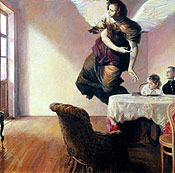 | Аллегории и метафоры исключительной дерзновенности придают «Новому Ангеларию» статус беспрецедентной акции. На этой выставке особая логика, поэтому нет ничего удивительного в том, что работы таких разных художников как Илья Кабаков, Сергей Стаканов, Люся Чарская, «Синие носы» и Андрей Бильжо втиснуты в прокрустово ложе кураторской концепции. Явленные зрителям парадоксальные варианты визуализации различных аспектов исследования генеалогии ангелов, больше всего напоминают результаты проективных тестов. В версиях современных художников ангелы - ожидаемо противостоят демоническим силам, исправно исполняют роли трансляторов различных посланий, опекают неразумных, и так далее. Колоссальное количество всяческих допущений в интерпретациях маркирует энтузиазм участников. Количество крыльев, пуха и перьев таково, что создаётся ощущение длительного пребывания на голубятне… |