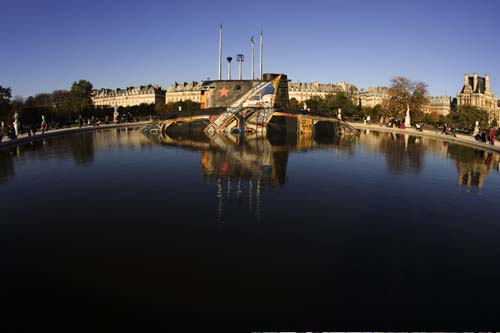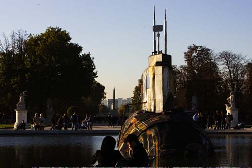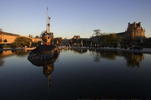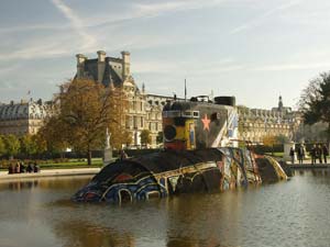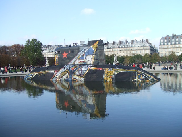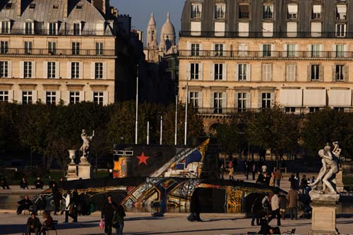 Подводная лодка, всплывшая в фонтане Тюльери на  Королевской Оси между двумя Триумфальными арками перед архитектурным ансамблем Лувра, наделала немало шума, когда поднимала свои перископы под мощные звуки “Варяга” и “Прощание Славянки”.