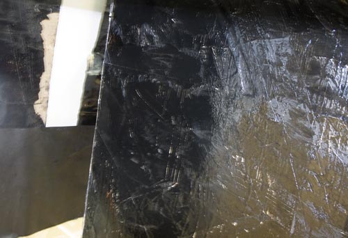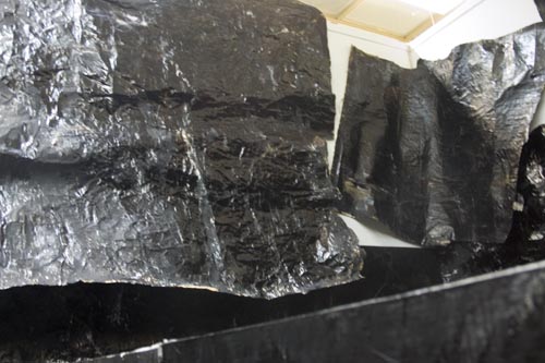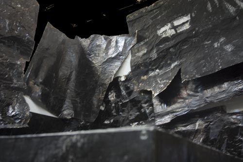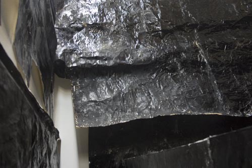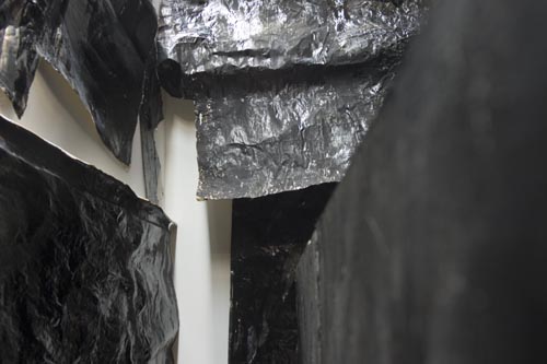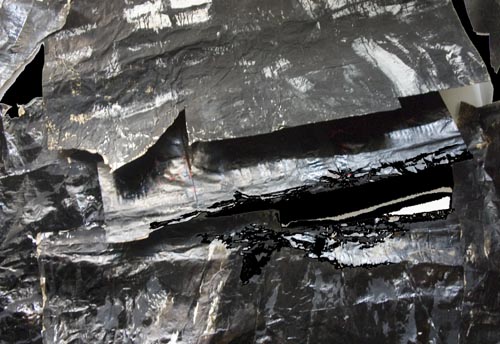 «Баня по-черному». Объект. Инсталляция. Бум., крафт, картон, газета, дерево, лутрасил, тушь, ПВА, мел, гуашь, акрил, черная масляная, черная для наружных работ и др. материалы. Звуковое сопровождение. 2006. Для экспозиции необходим закрытый бокс с дверью или проемом, шириной 60 см, с открытым верхом (без потолка), освещение; размеры бокса: высота 450см, основание – квадрат со стороной 600 см. Объект – инсталляция «Баня по-черному» состоит из: прямоугольного ящика 150х230х150 см: каркас – дерево, стены – картон, наружные стороны черные; 25-ти листов бумаги и картона разного размера от 50 см до 315 см, написанных в смешанной технике черными структурами, и звукового сопровождения длительностью 6 минут (запись звука огня, воды, хлестанья веником). Стены завешиваются по периметру черными структурами, в центр ставится черный прямоугольник, включается звуковое сопровождение по замкнутому циклу. |
