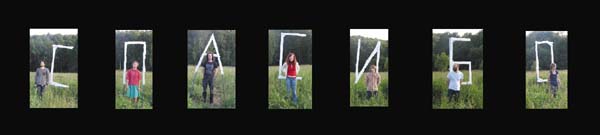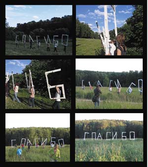 Наконец нас разделили на две неравные группы и повели к входу в лес параллельно друг другу. Художники несли слово СПАСИБО, составленное из отдельных букв. Дойдя до места, носители «аффирмативного» слова остановились, развернулись лицом к зрителям и три раза прокричали волшебное слово СПАСИБО. После этого предполагалось небольшое угощение чипсами и пивом, которое привезла какая-то девушка на мотороллере. |