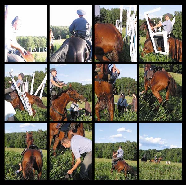 | С лошадиной морды падали клочья пены, и все это начинало напоминать какую-то сцену из раннего советского кино типа «Стачки» о разгоне демонстрации. В какой-то момент сильно пьяный коп потерял равновесие и упал под ноги собственного боевого коня, который рухнул на него. Нам же его и пришлось вытаскивать из-под испуганного миролюбивыми буквами животного. С большим трудом его подняли и посадили в седло – очевидно, у него все-таки было легкое сотрясение, и более трезвый сообщник уговорил его свалить от греха подальше. |
