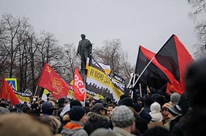Поскриптум. Последнее время мы с Женей Абрамовой работаем над проектом «Активизация коллективной памяти». Проект посвящен именно становлению гражданского общества, и сейчас мы занимаемся междисциплинарным исследованием советских монументов и площадей, на которых они расположены. По совпадению мы начали свои исследования с Болотной площади и памятника Репину. Обратить взор именно к этому месту предложил художник Ваня Новиков, который собирается на основе наших исследований делать арт проект. И вот такой поворот истории. Надо признать, что наши исследования уже несколько устарели, а прозвучавшее в рассылке месяц назад предложение Ромы Минаева взять в аренду памятник Репину (в свете новой городской политики предоставления в аренду культурных памятников), после 10 декабря звучит совсем иначе. Еще недавно памятник Репину был памятником узкопрофессионального значения, то есть в первую очередь консолидировал сообщество художественное, то теперь это монумент, неизбежно связанный с утверждением гражданских практик в нашей стране. Итак, искусство не поспевает за революцией. Однако, в визуальной образности Снежной революции Репин вполне может занять символическое место «Свободы на баррикадах» Делакруа. <Фото Влада Чиженкова> |