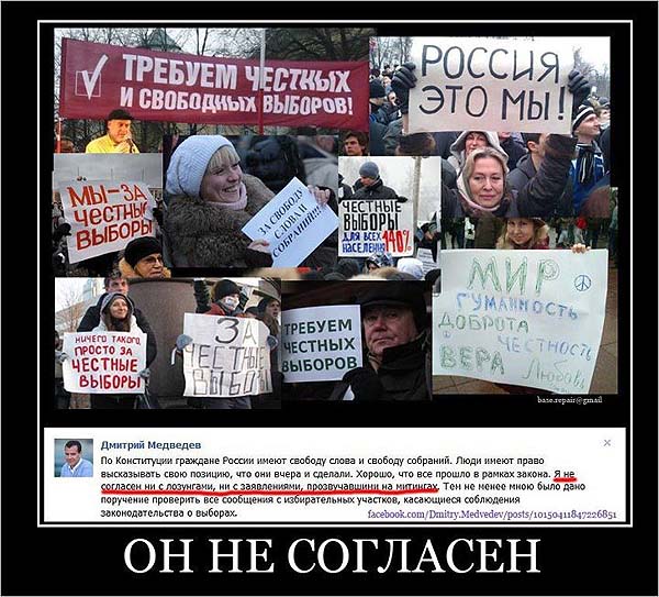 Каков же сюжет этой пьесы о революционном подъеме, уже получившем название Снежной революции? События декабря поставили всех нас перед фактом формирования гражданского общества. Думаю, «двойное дно», основной принцип позднесоветского менталитета, воплощенный в эпопее про Штирлица «Семнадцать мгновений весны», наконец стал неприемлем для российских граждан. Каждый вышедший на митинг выразил свое несогласие с лицемерием и откровенной ложью, которые унаследовала ныне правящая партия от позднесоветской системы. Интересно, но буквально на следующий день обнаруживаю на своей ленте в ФБ вот эту фотографию <Линда Тайдер> |