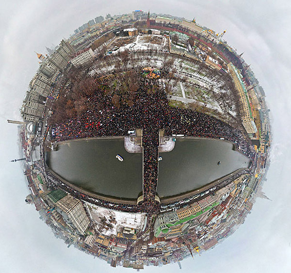 3. Болотная. «Думаю о том, что при счастливом повороте событий эпитет "болотный" имеет шанс обрести новое, исключительно позитивное значение. Это такой, если угодно, лингвистический вызов. Имеет смысл попробовать сделать это», пишет Лев Рубинштейн в Фейсбуке 9.12.12, пророча некое производство символических смыслов. Подхватила и Новая газета: «Болотная обрастает мифологией». Репортажи с Болотной – победоносное шествие коллективного тела гражданского общества о котором писал Алексей Пензин. В ориентации на традиции психогеографии ситуационистов и шизоанализа московской Номы позволю себе предложить территориальную интерпретацию Болотной. Это немного напоминает японские мультики (Миодзаки). Вот идет много-много людей, и из них возникает огромное существо. Могучий дух леса, или могучий дух гор, или Могучий дух Болотной площади. Воплощение могучего духа – фотография Ильи Варламова, сделанная при помощи управляемой модели самолета, к которой прикреплена фотокамера. Вероятно, игрушка того мальчика, что шел по Триумфальной площади с ранцем, догадываюсь я (потом я правда узнала, что на площади вертолет окрестили Карлсон), и замираю в восторге от сферичного тела. Оно и тело и дух, оно ощетинилось шпилями московских башен, у него огромные глаза-река в обрамлении человеческих потоков. На фотографии Ильи Варламова у этого мифического существа гражданского общества (о, чудесная случайность!) над надбровными дугами, прямо посередине, в месте, где должен располагаться третий глаз, обнаруживается … памятник Илье Репину (к этому удивительному факту я еще вернусь). Появление (рождение) тела гражданского общества сопровождается белыми лентами митингующих http://www.belayalenta.com/ и белыми цветами в руках полицейских. Все говорят о всеобщей любви и Снежной революции. Но это не «ветер на всем белом свете», это праздник рождения, нового года, весны, в общем, нечто незабываемое и восхитительное для всего белого света. Хотя если спуститься с небес и пройтись по площади, может сложиться совсем другая картинка (для этого стоит посмотреть личные отзывы участников в ЖЖ и ФБ). Но мне очень понравился клип, который там сняли (к сожалению не знаю кто именно) на песню группы Аркадий Коц (слова Александра Бренера, гитара - Кирилл Медведев, и др). <Фото Ильи Варламова> |