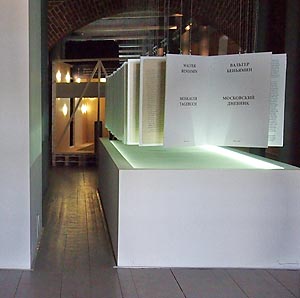 | Все представленные на выставке произведения, предметы, фильмы и документы были тщательно отобраны на основании текста московского дневника и в экспозиции сопровождались цитатами. То есть все экспонируемые предметы являлись овеществлением текста в пространстве или его визуализацией, вместе они создавали целостное высказывание, инсталляцию. В пользу версии выставки как инсталляции говорит и тот факт, что привычных этикеток в экспозиции не было, вместо них посетителям выдавался небольшой карманный путеводитель. В силу этого, на мой взгляд, вполне уместно говорить о выставке как синтетическом произведении, возникшем здесь и сейчас. Его коллективным автором стали участники кураторской группы: директор нижегородского филиала ГЦСИ Анна Гор, переводчик Беньямина Сергей Ромашко и коллекционер Павел Хорошилов, а также участники авторской группы, в которую, кроме выше перечисленных, вошли директор берлинского архива Беньямина Эрдмут Вицисла, издатель Беньямина Александр Иванов, архитектор экспозиции Сергей Ситар, художники Патриция Бах, Дмитрий Гутов, Давид Рифф, Ольга Чернышова. |