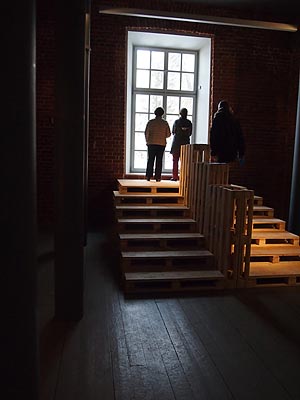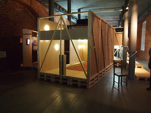 | Пол в комнате посвященной встречам был устлан протертой ковровой дорожкой, а в комнатке, посвященной игрушкам – стружкой. В комнате Любовь, в работе немецкой художницы Патриции Бах, пол (как и стены) был розовым, и на нем громоздились результаты долгой, из вечера в вечер повторявшейся игры в домино Вальтера Беньямина и Аси Лацис, педантично точно восстановленные на основе текста. Доски пола в комнате Политика, выдержанной в стиле рабочей комнаты отдыха, прогибались и пружинили при каждом шаге. |