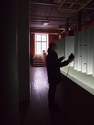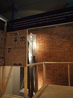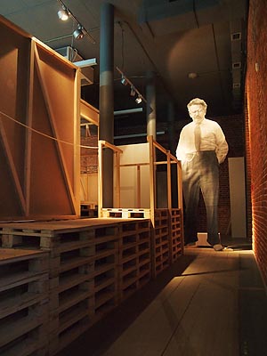 | Совершая движения по лабиринту этих экспозиционных зальчиков, зритель совершал восхождение и, выходя из экспозиции, оказывался на высоте в половину человеческого роста, в рост с расположенным там фотоизображением Вальтера Беньямина. Все эти интерактивные эффекты инсталляции, позволяющие зрителю не только визуально, но и на уровне ощущений проникнуть в текст, также являются частью синтетического произведения здесь и сейчас. На мой взгляд, несмотря на многочисленные эффекты интерактивности, выставка не переступает грань и не становиться развлекательным аттракционом, оставаясь произведением искусства. Акцент авторами экспозиции сделан на фактах личной биографии Вальтера Беньямина, на его экзистенциональных переживаниях времени, на субъективных, но острых и точных наблюдениях и оценках. Фигура Беньямина, во всем ее очаровании скромного интеллектуала, избежавшего великих искушений великой эпохи, в большей степени интересна нам, чем сама эпоха. |