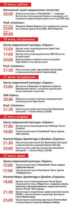 публикой. В этом году Медиа Форум планирует максимально полно познакомить московскую публику с творчеством одного из самых известных американских видеохудожников, одного из тех, кто сделал видеоарт таким, каким мы его сегодня знаем — Гари Хилла. Самые последние его работы будут представлены на выставке в GMG Gallery, а в Центре современной культуры «Гараж» планируется показ классических видео художника и его мастер-класс. За вечеринки Медиа Форума отвечают культовые сетевые художники JODI, и если вы хоть что-нибудь знаете о net.arte, то вам не нужно пояснять, кто они такие. В этот раз они собираются устроить live-перформанс в клубе «Солянка». Также в клубном формате состоятся показы лучших работ фестивалей Ars Electronica, Transmediale и Japan Media Art Festival. В этом году одно из главных событий — ретроспектива видеоарта Центральной и Восточной Европы «Transitland» со времени падения Берлинской стены и до наших дней — включает в себя мероприятия разных форматов. Для тех, кто любит неторопливо переходить от работы к работе, возвращаться к недосмотренным фрагментам и пересматривать особенно понравившиеся, в Московском музее современного искусства откроется выставка. Те, кто предпочитает киноформат, смогут посетить показы в Центре современной культуры «Гараж»: общая программа разбита на три тематических видеоподборки, каждая из которых будет транслироваться отдельно. Те же, кто больше всего ценят живое общение с художниками, придут на мастер-классы Анри Сала, Милики Томич и Эгона Бунна. Дискуссия соберет критиков и искусствоведов, которые также не упустят шанс высказать свое мнения о видеоискусстве после падения Берлинской стены. Впрочем, тем из наших зрителей, кто хочет получить максимально полное представление о теме, не стоит пропускать ни одно из событий: видеоработы не повторяются. |