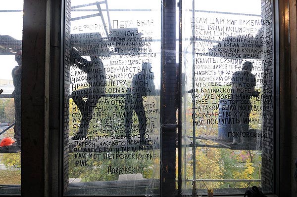 было выставлять в отдельном помещении на месте икон. Можно выделить две типа высказываний. Работа Николая Олейникова и в целом выставка Ненадёжная жизнь представляют собой ясные и лаконичные послания. Этот тип высказывания можно назвать иллюстративным. Высказывания иллюстрируют ситуацию эксплуатации, в которой находятся, но таким образом как будто не замечая её. Второй тип высказываний можно назвать демонстративным, они ставят зрителя в ситуацию, в которой проблема, которую демонстрирует работа, касается зрителя непосредственно. Как работа Андрея Кузькина или Ильи Будрайтскиса. Поскольку в работе последнего за отвлечёнными цитатами главы марксистской исторической школы в СССР Михаила Покровского, написанными на окнах, по покрывающим дом лесам весь рабочий день движутся мигранты, а за ними открывается вид на современную Москву. |