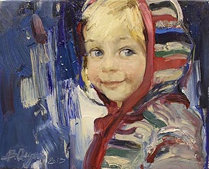 Название нынешней выставки «Там, где попугаи говорят на забытом языке», но она не о попугаях. «Там, где попугаи говорят на забытом языке» - это о живописи, о поиске содержания, о нащупывании болевых точек в  живописи. «Раньше я называл выставки, апеллируя к тому, что сделал, - говорит художник. Что было изображено, то было и в названии. Здесь же все получилось сложнее.  Мне хотелось, чтобы ощущение было, как бы мнимым, абстрактным. Эта мнимость  проходит через каждую работу, вне зависимости от техники». В экспозиции два  типа работ, написанных по-разному, в разных техниках. В первом случае художник называет живопись, «глянцевой», «текучей», «стеклянной» (она написана по всем правилам, на грунтованном холсте, с лессировками). Во втором случае живопись называется «бархатной». Бархатной она получается, если писать на другой стороне  грунтованного холста, нетронутой олифой и клеем. Краска тогда впитывается в материю,  поверхность становится бархатной. Так  написан, например, «Мальчик с гусем», в  отличие от глянцевого «Акробата». Как у  Герхарда Рихтера, делящего свои холсты  на «прозрачные» и «сгущенные», главной