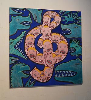 Литичевский, новые работы. Хорошо темным осенним вечером идти по набережной. Хотя набережные Москвы вовсе не так хороши, как набережные Рима, Парижа или Петербурга. Но все равно хорошо. Даже длиннющие промзоны не могут убить реку. Студия «К.О.П.» (Константинова – Острецов – Пахомов), куда не слишком просто добраться, находится на одной из таких московских набережных, Бережковской. Удивительная атмосфера единомыслия, доброжелательства и всеобщего братства, что нынче встречается редко, отличает этот дом с открытой террасой и сталкеровскими видами на корпуса завода «Пластик». Мастерская известных художников Гоши Острецова и его жены Людмилы Константиновой (третьим, что видно из названия К. О. П. был еще и Сергей Пахомов), функционирует как художественный эпицентр, как полноценная арт-резиденция. Так было придумано изначально. А ежемесячная работа художников в резиденции всегда заканчивается короткой персональной выставкой, «художественной средой». Новый осенний сезон 2013 открыл в резиденции художник-интеллектуал Георгий Летичевский, известный московский человек, теоретик и практик ИЗО. Два живописных холста и графический лист – вот итог пребывания художника в резиденции К.О.П. «Эти работы были сделано в мастерской за месяц, - говорит Георгий Литичевский. Не очень много времени затрачено, но и не так уж мало. Здесь есть и графика, и живопись, но не традиционные холст-масло, а более мобильные акрил – холст. Масло, в отличии от акрила, требует более стабильной жизни, которой у меня нет» (Художник живет на два города: Берлин и Москву, и в каком городе больше проводит времени, не знает и сам). Творческий метод художника Георгия Литичевского любят определять как бесконечный концептуальный комикс, любят сравнивать его с Роем Лихтенштейном. Непрерывно сменяющиеся сюжеты в его живописных и графических комиксах совсем не просты. Они - размышления о природе искусства. Является ли искусство реальностью от нас независящей? Или искусство лишь следствие наших действий? Просто эффект, произведенный языковыми и знаковыми упражнениями? Каждой работой Георгий Литичевский пытается этот конфликт разрядить, разрешить, прояснить, что касается и последних его произведений. Если сконцентрироваться на проблеме, то это - проблема роли знаков в реальности. Нынче на одной картине у него в дремучем лесу гуляют два туалетных знака, женский и мужской. «Для меня почему-то никогда не являлось очевидным, что треугольник направленный вверх или вниз обязательно обозначает определенный пол. Речь идет лишь об условности кардинально лежащей в основе нашей жизни, условности, которая не является незыблемой». На другой его картине разместился наглый скрипичный ключ, окруженный химерами (см. фото). «Эта картина - тоже размышление о природе знака, и об искусстве конечно. Является ли искусство сверхчеловеческой гармонией? Или оно просто свод правил? Знаков?» В третьем произведении, графическом комиксе проговорены те же проблемы. |