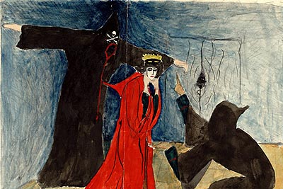 Так что «Рисунки поэтов», выставка, получается не просто коллекционная, но где-то концептуальная. Чего тут только нет! И агитплакаты «Окон РОСТА» Маяковского, и портреты Сергея Есенина, Алексея Толстого, Бориса Пильняка, Михаила Кузмина, нарисованные Сергеем Городецким, и иллюстрации Андрея Белого (фото слева), к его «Петербургу» и «Маскам», и обаятельные крымские акварели Максимилиана Волошина. |