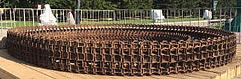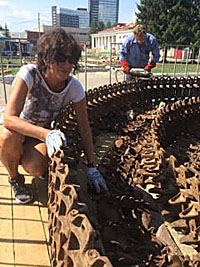 Там же рядом с Екатеринбургом - Нижний Тагил, где находится производство танков и другой военной техники…«Колизей» - это обращение к военной теме, уходящей в толщу земли, грунта, скальных пород и истории. Мне очень хотелось закрутить гусеницы в спираль, уходящую вглубь земли, в грунт, как в грунт истории. Директор Центрального парка, где проходит фестиваль, генерал-майор Шадрин, танкист, прошедший уже три войны, и его помощник майор Ермек, тоже бывший танкист, показали, как правильно гусеницы разбирать на звенья. Но асфальт дробить на центральной аллее парка, где сейчас стоит «Колизей», не разрешили. Поэтому пришлось его поднять на подиум и несколько изменить «рисунок». В следующий раз обязательно осуществлю свой первоначальный замысел! «Колизей» я посвятила Ги Дебору (Guy Debord), его великому произведению «Общество спектакля» («The Society of the Spectacle»). |