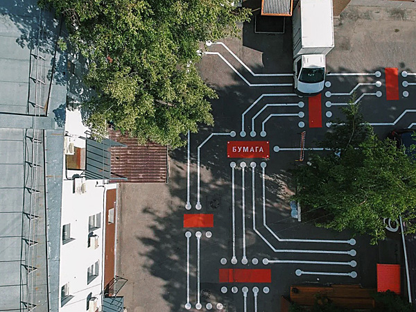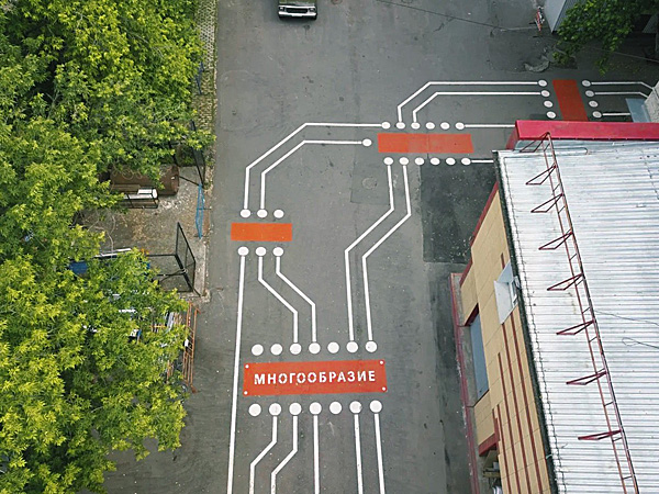 на асфальте создан в традиционных цветах «Фабрики»: белом и оранжевом, с