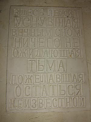 Потеряв собственную хватку и оказавшись в тисках нового ритма, они добровольно расстаются с художником в себе, ради иного статуса, понемногу растворяясь в кипящей массе успешного креативного класса». Этот проект - про жизнь и судьбу отечественного художника, родившегося в конце социализма и попавшего в лапы второго русского капитализма, государственно-олигархического, самого худшего из всех видов капитализма. Этот проект про то, как авангардист быстро и неожиданно превращается в креативщика. (Год рождения героя – конец 60-х прошлого века. Место рождения – мегаполис. Образование – хорошее, гуманитарное, бесплатное. Военнообязанный. В армии отслужил. Взгляды – самые передовые. Ну и так далее). Одним словом, прям по Пелевину – от «Gneration П» до «Empire V» . Как далее подробно и правильно написано в пресс-релизе: «На выставке мы предъявим работы нескольких художников на первый взгляд совершенно не связанных между собой, однако связь существует, авторов объединяет нечто большее, чем скажем стилистическое сходство или приверженность некой традиции. Их роднит тотальное отсутствие творческих амбиций, готовность порвать со своим художественным прошлым или предложить его в обмен на Другое будущее. Поэтому вы не узнаете имен тех, кому удалось расстаться с собой как художником – представленные работы выставлены на условиях полной анонимности. Такой отказ от авторства ставит всех авторов в одинаковое положение, более того, он превращает всех авторов в одного анонимного автора, с одной универсальной судьбой, которой хватило на целое поколение, поколение художников пожелавших остаться неизвестными». Вот так-то, господа!