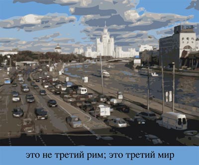 он не хочет есть кашу или макароны, ну что-то отвратительное, как и сам рекламный постер). На социальную рекламу тянет (о вреде курения или вообще о жизни-смерти?) и «Мир, труд, май, июнь, июль, август». Этакая надпись под задумчивым персонажем: сколько же осталось? Май? Июнь? Июль? Может быть еще и август? Великолепен и московский пейзаж «Спасибо товарищу Путину за хорошую погоду», и поезд «Москва-Нью-Йорк», и два мавзолея на Красной площади: «Медведев»; «Путин». Конечно, прекрасна и кабаковская кастрюля: «Чья это кастрюля? Это кастрюля Кабакова. А где Кабаков? Кабаков в Америке. Осталась только кастрюля». Одним словом, весело и радостно. Как всегда. Ну и хорошо. Ну и правильно. Надо сказать, что в данном проекте, галерея представляет не живопись Константина Латышева, а принты на виниле, довольно большие, (где-то около 120 x 150 см). Тираж органичен. Цены вполне доступные. (Их можно узнать здесь же, так как галерея стала участницей плана Open Price). Человек с натренированным взглядом, знающий не по наслышке московское искусство обязательно оценит этот проект по всем пунктам.