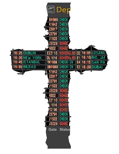 Кланяйтесь «Большому говорящему кресту» (группа «Electroboutique»), «вырубленному» из аэропортного электронного табло. (Регистрацию вам