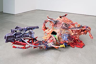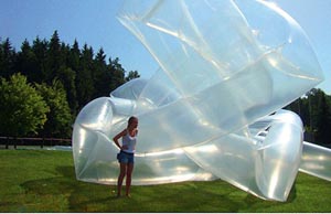 Все 11 художников хорошо знакомы московской публике. Если идти в глубь парка по левой стороне от входа, то непременно наткнешься на огромную воздушную инсталляции. Алексея Костромы «Узел». Художник, живущий большей частью в Берлине и прославившийся оперенными и оскорлупленными объектами, в последнее время выбирает в качестве материала упаковочный пластик.
