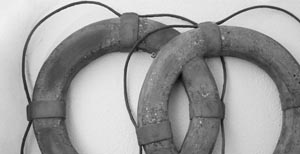 Чтобы найти работу обманщиков-абсурдистов Сергея Воронцова и Юлиана Бардолима, надо повернуть к Лебединому мостику. Там подвешено два спасательных круга, слепленных из бетона.