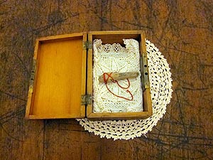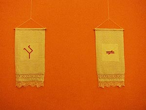 А мир этот представлен разного рода объектами и предметами, предметами очень личными, рукодельными, авторскими. В них проявляется пристальный интерес Агафьи к тайному миру знаков, раскрыть смысл которого способен или художник или мистик. Здесь есть шитые ковры, хоругви, гадальные карты. Есть записки на листах бумаги в клеточку, вырванных из тетради, в которых Пророчица фиксирует свои сновидения.