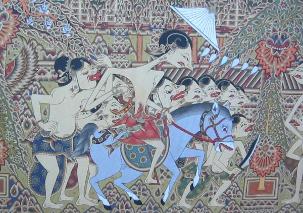 Главный экспонат, это самое шестидесятиметровое полотно, назначено для спектаклей театра ваянг бебер. (Термин «ваянг» используется как для обозначения самого театра, так и для названия кукол, используемых в постановках. Наиболее широко такое действо распространено на островах Ява и Бали. «Бебер» же в индонезийском языке означает «раскручивать, разворачивать»). В театре ваянг бебер нет актеров. Здесь есть только распорядитель действа – даланг, рассказчик, Он и сопровождает свою историю показом рисованных картин, намотанных на два вертикальных шеста, которые потепенно раскручивает. Далангу аккомпанируют музыканты. Они играют на ударных: ксилофонах, гонгах и ребабе. Ваянг бебер – искусство исчезающее, практически исчезнувшее. Чтобы лучше понять и разобраться в сложносочиненных экспонатах выставки, стоит обратить внимание на расширенный этикетаж, объясняющий каждую сцену, каждый персонаж в отдельности. Здесь все очень красиво.