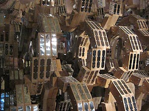 цивилизации». Этот многосложный проект впервые был показан в 1999 году в Палермо. Его также привозили на биеннале современного искусства Arsenale 2012, прошедшей осенью в Киеве. Проект, смонтированный в галерее Red October, включает в себя 37 инсталляций и состоит из 140 самостоятельных работ, коллажей и авторских текстов. Надо признаться, что смотреть его нелегко и многотрудно. «Памятник», демонстрирует два архитектурных макета, в которых подробно показано - рассказано, как нужно устроить подземный лабиринт с обычным сквериком наверху (для конспирации). Бесконечные чертежи, эскизы, фотографии, аннотации и прочие необходимости развешены и уложены в архаично-советские витрины и рамочки. Темы все те же, традиционно кабаковские: коммунальная кухня, красный уголок, читальный зал… |