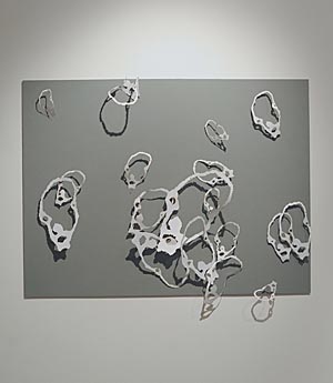 Третий зал посвящен «Внутреннему Миру Человека». Здесь бумажные формы Сергея Огурцова, лишайники Ильи Долгова, веревочные волны Натальи Зинцовой и визионерские пейзажи Юлии Ивашкиной предлагают зрителю всмотреться в себя. (Ну, если не в себя, то в кого-то другого, во что-то другое). Бумажные узоры Сергея Огурцова «Orakel Und Spektakel» происходят из рисунков Урлики Цурн, немецкой сюрреалистки 30-х годов, перерисовывающей рисунки душевнобольных. (История послужила для Сергея Огурцова источником вдохновения). Безумие - это и есть такой «другой», такая «другая цивилизация», в которую очень пристально всматривается искусство… |
