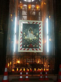 | Фотография молодой арабской женщины комфортно расположилась в одном из приделов церкви, возвышаясь над грудой металлического хлама и окруженная сигнальными огнями. По мнению священника этого храма, работа художников позволяет по-другому взглянуть на религиозные ценности в период, когда католицизм представляется застывшим в своих догмах. До этого в храме выставлялись Кэйт Харинг и Раймонд Масон. |