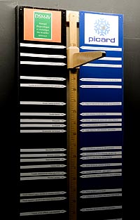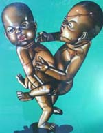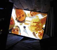 Вторая выставка представляется еще более маргинальной и «брютальной» и посвящена терапевтическим художественным практикам Марко Декорпелиада, больного шизофренией. Насколько действены художественные практики в подобных пограничных случаях, судить сложно, но, так или иначе, некоторая сила завела художника в Амазонию, где он и погиб пару лет назад. На выставке можно видеть сконструированный художником шизометр, ставящий в строгое соответствие разновидности психических заболеваний и замороженные продукты из каталога. Несмотря на абсурдность, соответствия возникают занятные: вроде «миниатюрные морковки» - «истеричность». Как истинный одержимый, художник придает графически выразительную форму своей мании и пытается понять, как возникают «дыры» : таинственным образом, гребешкам, ракушкам святого Иоанна, ничего не соответствует. До 16 мая 2010.