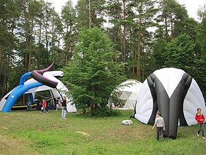 За положительный настрой посетителей фестиваля отвечали "пневмоконструкции" Ивана Тимофеева, похожие на гигантских надувных рыб, очень забавно смотревшиеся среди елей и березок.