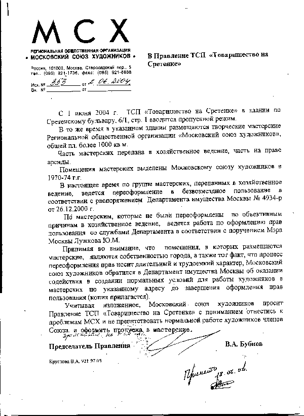 5. Письмо Региональной общественной организации МСХ (Московский союз художников)  в Правление "Товарищество на Сретенке" (Товарищества собственников помещений). 2 июня 2004>