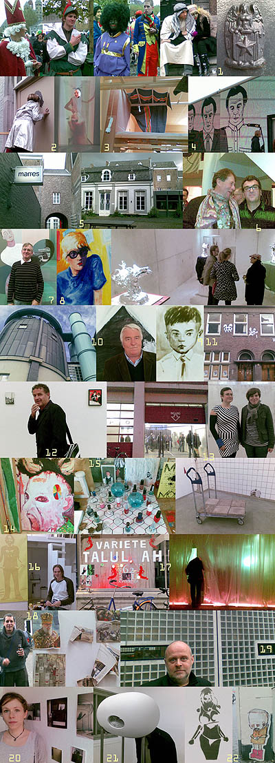 В доме Van Sint Fietов конечно же собираются все прочие искусством заинтересованные личности. Такие как Кики Niesten. Владелица лучшего бутика под шумок Great Indoors Awardа презентовала новый филиал для продажи "подержанного" через интернет (финансовый кризис?). Интригующая портальная инсталляция магазина создана местным художественно-подрастающим поколением (иллюстр. 2). Именно от Кики гость региона может получить безумный сувенир в виде местного пудинга (купленного скорее всего в ближайшем гастрономе) в подтверждение версии отсутствия в Голландии десерта как такового. …не считая пудинга. Или Lene ter Haar родом из Мюнхена. Официально - куратор центра Schunck в городке по-соседству - она прочно осела в пустующих зданиях городского центра. От Lene можно узнать не только о неофициально организованном ею центре Kunstraum B32, также расположенном в пустуюшем здании 32 на Bourgognestraat (иллюст. 11), но и многое из истории легального захвата домов и нового закона, угрожающего привлекательной голландской традиции (пара других широко известна и в дополнительных объяснениях не нуждается). Полученная практичная информация и координаты Obedа Verbeek (он же предводитель крупнейшего местного "захвата" Landbouwbelang) полезны в связи с тем, что вновь прибывшему чужаку подобный образ существования представляется полной романтизма социальной загадкой. От Van Sint Fiet и его художественно-семейного очага общее движение происходит обратно в направлении набережной реки Маас и зелёным лазером засвеченной башне-трубе Bonnefantenmuseum по проекту Mario Botta. Благодаря интерьерщику Maurice Mentjens (магазины Stash) и его гостеприимному автомобилю через пару минут мы на вечеринке, устроенной в честь музейного юбилея директором Alexander van Grevensteinом (иллюст. 10). Празднуется среди бесконечного ряда мелкомасштабной портретной живописи "Live Forever" Elizabeth Peyton (иллюст. 8: David Hockney, 9: трёхлетний Rirkrit). Издатель художественного журнала Zuiderlucht (южное небо) и саркастичный знаток культурной жизни всей южной трёх-государственной лимбуржской провинции Wido Smeets на сей раз удивляет несаркастичным восприятием полотен, а также своей странной заветной мечтой посещения Сибири (иллюст. 12). Когда-то значительный монастырский центр, Маастрихт полон церквей, утративших своё первоначальное предназначение и продолжающих существование second life в виде дизайнерских отелей типа Kruisherenhotel по проекту Henk Vos (в бывшей церкви Kruisheren 1438-го года), кафе с крестоподобными столикамм в алтарном готическом пространстве или магазинов типа Selexyz bookstore по проекту Evelyne Merkx (в бывшей доминиканской церкви 1294-го года) с многоуровневой свободностоящей конструкцией презентации, доходящей почти до крестового свода с росписями. Центральная площадь города носит оптимистическое название "Кладбище" и готова принять мероприятия любого уровня и вкуса. От пьянствующих карнавальных туров (иллюст. 1) с неизбежными массовым piss-перформансами вдоль набережной реки Маас до концертов давно утомившего весь мир своей скрипкой великого сына города André Rieu. Иногда сюда из столицы по заказу Marres заезжает мобильная крупноэкранка "dropstuff", которая, несмотря на отсутствие содержания, выглядит довольно забавно в городском пространстве. Эдакий проп без агита (иллюст. 4). В настоящее время Маастрихт из церковного центра превратился в студенческий и предоставляет многочисленные возможности художественного обра