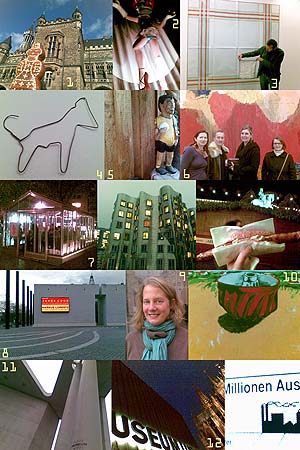 Местное отделение художественного объединения BBK обладает камерной галереей и турбо-активным женским коллективом. Christine, Barbara и Ilse Gisela Klaßen - та самая, которая производит занимательных собак из металлической проволоки и всего за 200 евро за штуку (иллюстр. 4) - сразу предлагают забежать на пару коктейлей в близлежаший Düsseldorf. После посещения Museum Kunst Palast (иллюстр. 6: слева направо Barbara Golley, Christine Stamer, Barbara Geier, Mirela Anura и работа Per Kirkeby) перемещаемся в бар Lido, расположенный на мосту новомодного портового райончика Medienhafen неподалёку от "подвыпивших" домов Franka Гери. Позднее Mirela успевает показать очередную экспозицию в местном павильоне Offenes Glashaus am Worringer Platz на оживлённом городском перекрёстке (иллюстр. 7) и подкрепившись Heisswurst в историческом центре города откладываем посещение Кёльна и Бонна на завтра. |