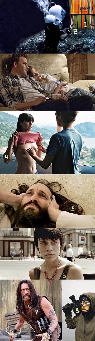 VIennale10 или победил Китай После тяжёлых дней и ночей с просмотром более сорока фильмов (не учитывая короткометражных) пришло время передохнуть, насладиться свежим воздухом и дневным светом и заняться освоением всех или хотя бы большей части посещённых венских кинопремьер. VIennale-промоушен, состоящий помимо полосатой дизайнерской сумочки (иллюстр. 1) из клипа Apichatpong Weerasethakul'я (иллюстр. 2). Apichatpong Weerasethakul (любимец директора фестиваля Hansа Hurchа и в упрощённом варианте - просто Jo) также представил на VIennale свой уже нашумевший фильм "Lung Boonmee raluek chat" (Uncle Boonmee who can recall his past lives) о смертельнобольном дядюшке Бонмее и его многочисленных мистических столкновениях, происходящих в районе джунглей Тайланда… Можно посмотреть… но со скидкой на периодически проскальзывающие типичные дальневосточные эзотерические интонации… человеко-обезьяны со светящимися глазами… духи умерших жён в полупрозрачном состоянии делающие пока ещё живым мужьям инъекции… совокупляющиеся с рыбами престарелые принцессы…сбегающие из монастыря в целях наслаждения горячим душем и впоследствие раздваивающиеся в параллельных временных пространствах монахи… О фильмах - по порядку просмотра, для упрощения структурированного восприятия-комменирования. Woody Allen и его новое творение "You will meet a tall dark stranger" с участием Naomi Watts (Sally), Josh Brolin (Roy), Antonio Banderas (Greg), Gemma Jones (Helena), Freida Pinto (Lalita), Lucy Punch (Charmaine) и Anthony Hopkins (Alfie)… Милая Алленовская постановочка на фоне Лондона. Актёры хороши и порой даже остроумны. Но в общем и целом фильм скучен и закадровое утверждение "Illusions work better than medicine" в данном случае выпадает из контекста… Брошенная мужем Helena проводит всё своё время между бутылкой скотча и посещениями предсказательницы будущего Cristal. Муж Helenы Alfie женится на call-girl Charmaine. Дочь Helenы Sally влюбляется в своего босса и галериста Gregа, который порвав с женой заводит аферу с художницей, являющейся одновременно подругой Sally. В это время муж Sally - писатель неудачник Roy - подпадает под очарование девушки из окна напротив, которая, не устояв перед ухаживаниями Роя, вскоре отменяет свою помолвку с симпатичным дипломатом… Смотреть не нужно. "Cold Weather" - один из лучших фильмов, представленных на VIennale. Очередная малобюджетная работа американского режиссёра Aaronа Katzа, со слегка абсурдной историей, оканчивающейся совершенно неожиданно. Хороши непрофессиональные актёры, прежде всего Cris Lankenau в роли Dougа, безсмысленно проводящего свою молодость в Портланде (где всегда холодно) и зарабатывающего на проживание бесконечным перетаскиванием коробок со льдом (на фабрике по производству гастрономического льда)… или Raúl Castillo в роли коллеги по перетаскиванию льда Carlosа (он же диджей)… или Robyn Rikoon в роли бывшей подружки из Чикаго, заехавшей в Портланд в командировку, постепенно превращающаяся в криминальную историю, включающую call-girl-бизнес, полный денег чемодан, отгадывания зашифрованных посланий, преследования на потасканных автомобилях… Благодаря операторской работе, странному шарму Crisа Lankenau и mumblecore-эстетике этого инди-фильма… Безусловно смотреть! "The White Stripes: Under Great White Northern Lights" - стоминутная попытка документирования гастролей группы снятая Emmett Malloy и, невзирая на White Stripes-саундтрэки, вызывающая постоянное состояние сонливости. Jack и Meg в Канаде, Jack и Meg между отрывками из пары песен, Jack и Meg садятся в автомобиль, и Jack и Meg выходят из а